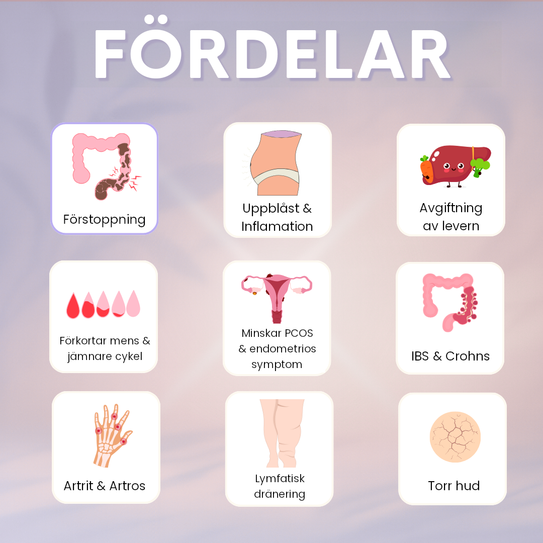 Du kan använda den dagligen så länge du behöver. De flesta kunder inkluderar den som en del av sin långsiktiga veckovisa hälsorutin. Om du gör en detox rekommenderar vi en 30-dagars nystart. Du kommer märka att det är dags att pausa när uppsvälldhet, inflammation eller hormonella symptom stabiliseras.